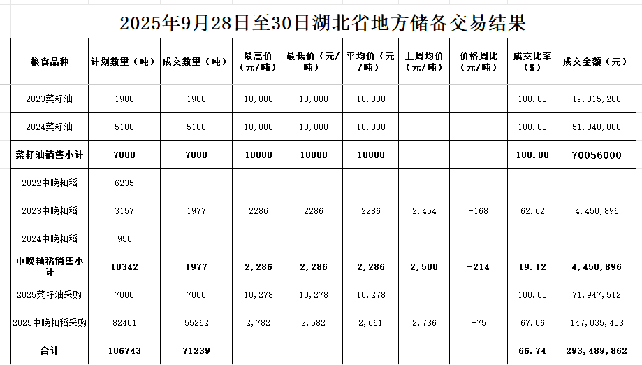 本周湖北地储成交各类粮油71239吨。其中销售:2023年菜籽油1900吨,成交率100%,成交均价10008元/吨;2024菜籽油5100吨,成交率100%,成交均10008/吨;2023年中晚籼稻2286吨,成交率62.62%,成交均价2286/吨,环比下跌168元/吨。采购:2025年菜籽油7000吨,成交率100%,成交均价10278/吨;2025年中晚籼稻55262吨,成交率67.06%,成交均价2661/吨,环比下跌75/吨